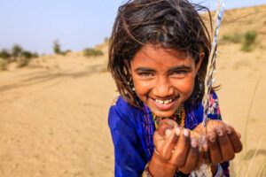 Indian little girl is drinking fresh water, desert village, Thar Desert, Rajasthan, India. Potable water is very precious on the desert – Rajasthani women and children often walk long distances through the desert to bring back jugs of water that they carry on their heads.