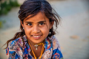 Indian little girl standing on a sand dune in desert village, Rajasthan, India.